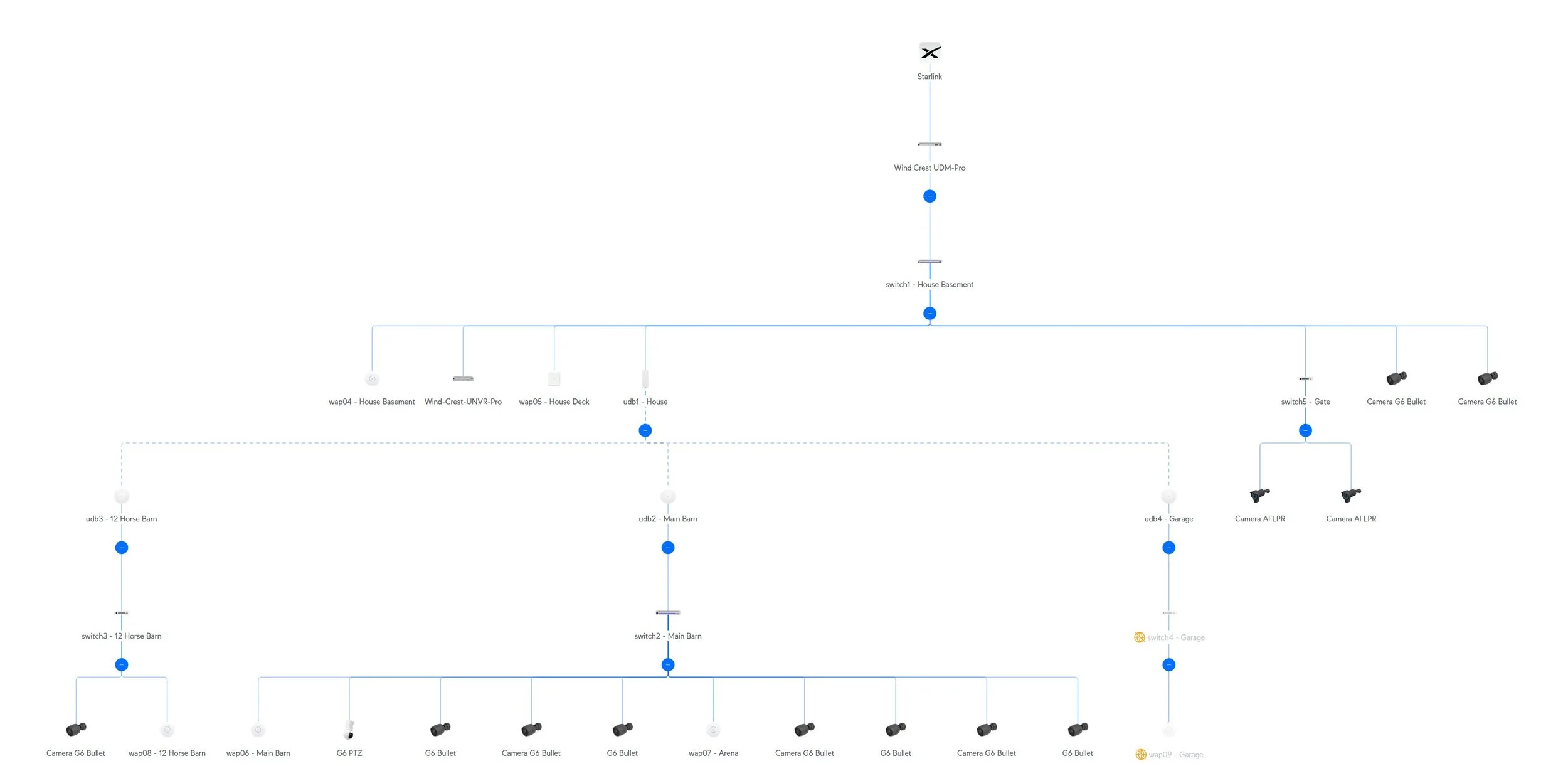 The network consists of a firewall, five switches (house, three barns, and the main gate of the property), and nine Wi-Fi Access Points.